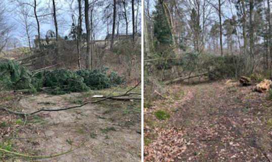 væltet 8 store træer, som ligger hen over den første del af vejen ned til